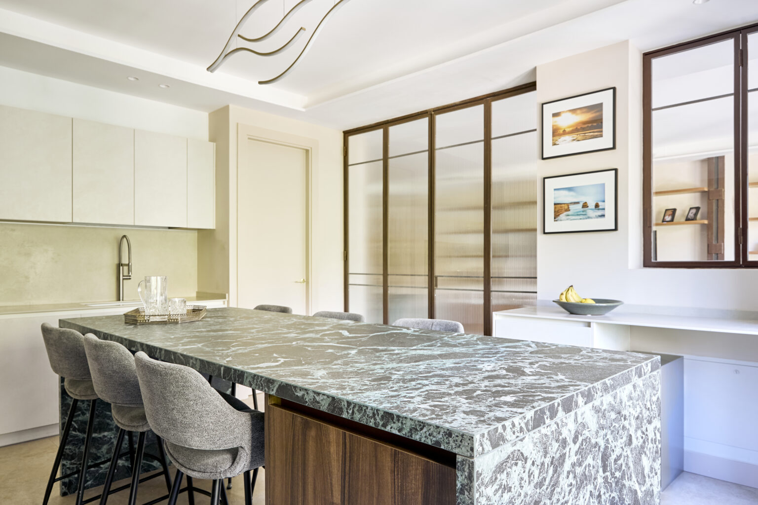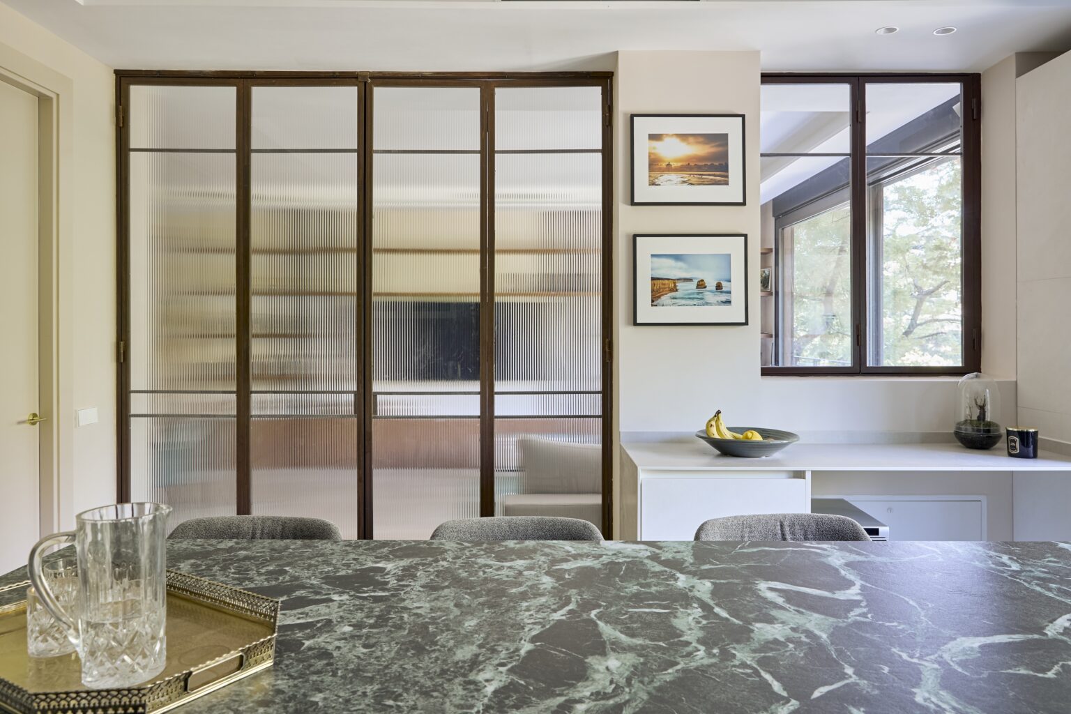 En esta vivienda madrileña, la protagonista indiscutible es la isla XL revestida en Laminam Verde Alpi, una superficie cerámica que reinterpreta la elegancia del mármol italiano.