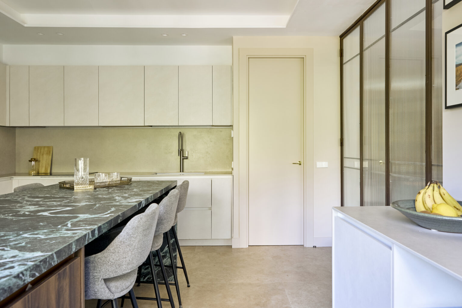 El resultado es una cocina que equilibra la fuerza del verde con la sutileza de los tonos neutros. Los acabados claros, la luz natural y la geometría limpia del mobiliario aportan equilibrio visual, dejando que la textura del material hable por sí misma.